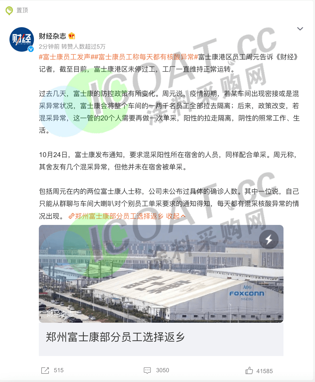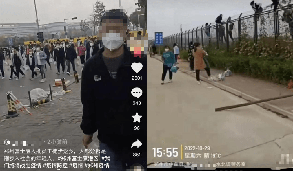 近日,知名电子大厂富士康郑州工厂大批员工徒步返乡一事登上热搜并引发关注。网传视频显示众多员工携带行李三三两两的走在马路上,从白天到黑夜依然未见停歇,甚至还有翻越围墙、钻出墙洞的员工。而他们徒步百余公里的“大逃亡”无疑源于“郑州园区约2万人确诊”的传闻。