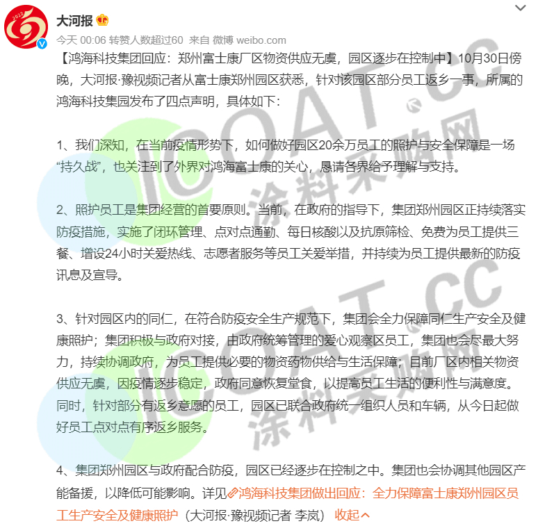 富士康所属的鸿海科技集团回应部分员工徒步返乡时表示,会协调其他园区产能备援。其还表示网传的“郑州园区约2万人确诊”是严重不实信息。截至目前,富士康厂区未发生重症感染现象,疫情总体可控。此外,当地政府已向富士康派驻工作组。