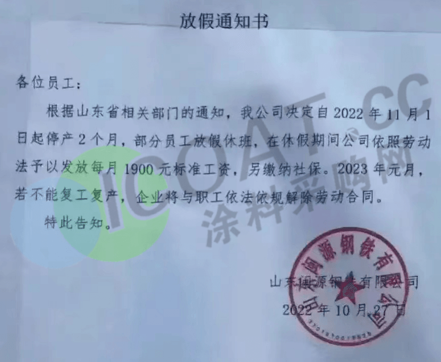 山东某钢铁厂表示,自11月1日起停产两个月,休假期间依照劳动法予以发放每月1900元标准工资。2023年元月,若不能复工复产,企业将与职工依法依规解除劳动合同。