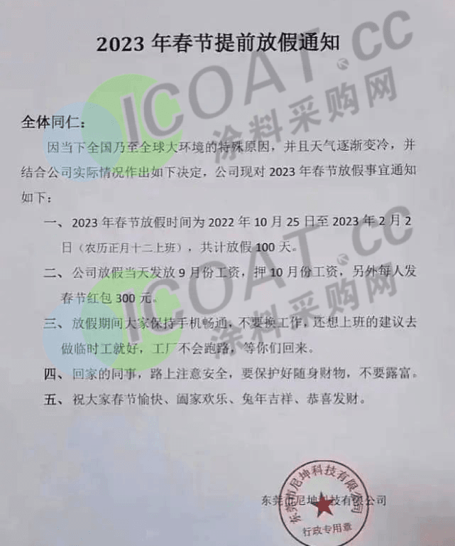 广东东莞某工厂已于10月25日正式放年假,放假到2023年的2月2日,假期足足有100天之多!
