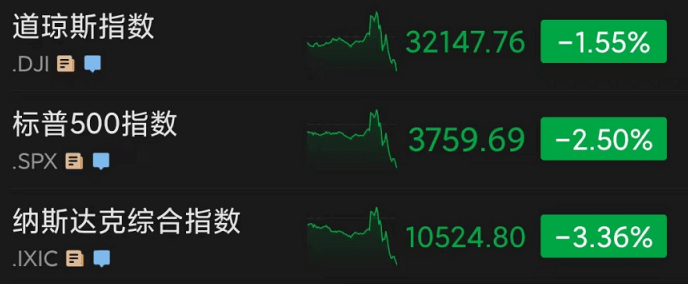随后美股三大指数集体跳水,截至收盘,道指跌505.44点,收于32147.76点,跌幅为1.55%,盘中一度涨超400点,收盘自高位回落超900点。标普500指数下跌2.5%,收于3759.69点。纳指下跌3.36%,报收于10524.80点。美股三大股指目前已连跌三日,标普500指数创下10月7日来最大跌幅。