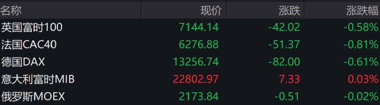 欧洲三大股指收盘同样全线下跌,德国DAX指数跌0.61%报13256.74点,法国CAC40指数跌0.81%报6276.88点,英国富时100指数跌0.58%报7144.14点。