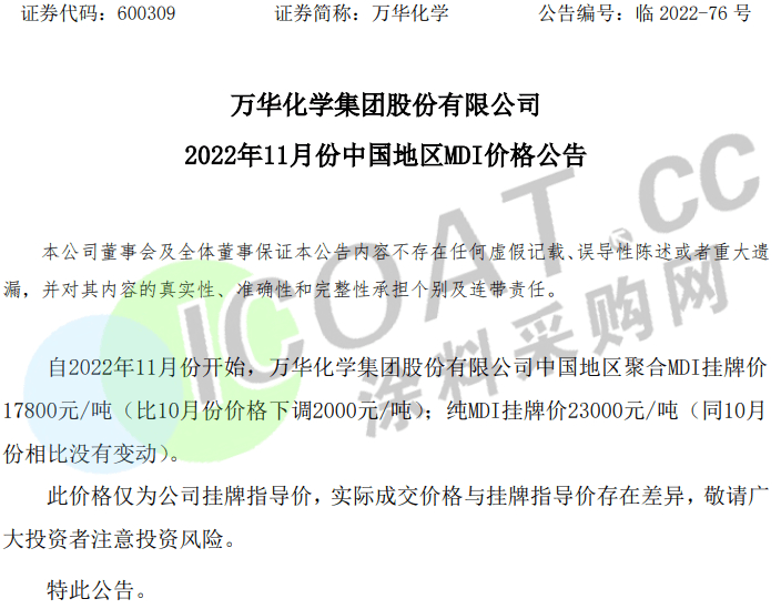 万华化学近日公告,自2022年11月份开始,公司中国地区聚合MDI挂牌价17800元/吨,比10月份价格下调2000元/吨。