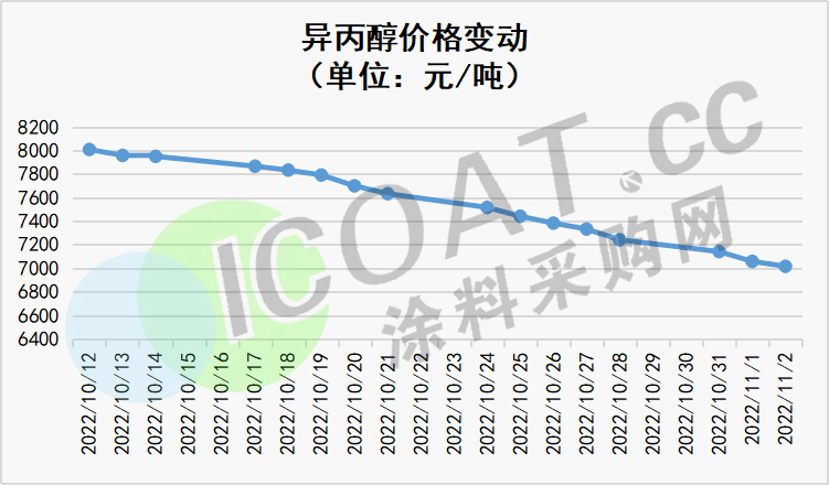 异丙醇从8008.33元/吨跌至7016.67元/吨,报价15连跌,累计下跌991.67元/吨,跌幅12.38%。