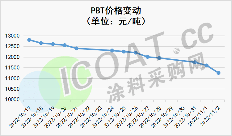PBT从12800元/吨跌至11250元/吨,报价12连跌,累计下跌1550元/吨,跌幅12.11%。