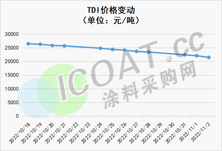 TDI从26433.33元/吨跌至21458.33元/吨,报价11连跌,累计下跌4975元/吨,跌幅18.82%。