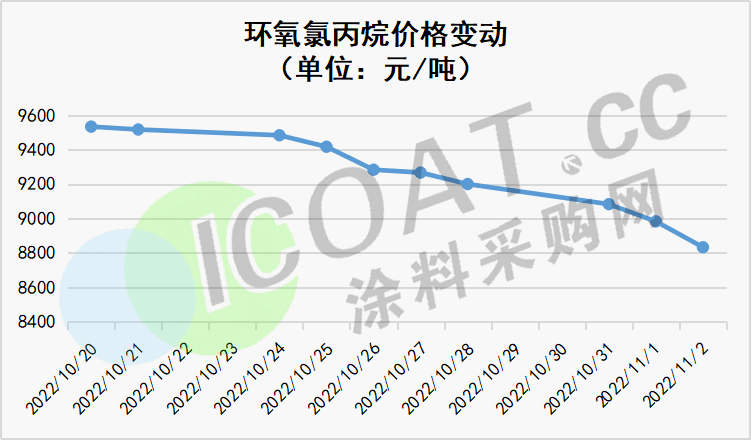 环氧氯丙烷从9533.34元/吨跌至8833.33元/吨,报价9连跌,累计下跌700.01元/吨,跌幅7.34%。