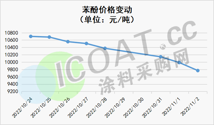 苯酚从10700元/吨跌至9768.75元/吨,报价7连跌,累计下跌931.25元/吨,跌幅8.70%。