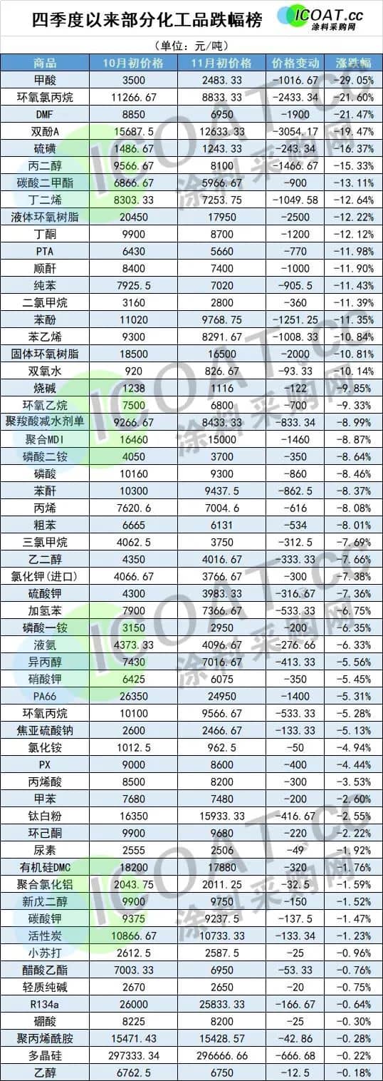 此外,四季度以来,60多种化工品报价下跌,甲酸、环氧氯丙烷、DMF等报价下滑近3成,双酚A、硫磺、丙二醇等报价下调近2成,环氧树脂、环氧氯丙烷、聚合MDI、苯乙烯等吨价下调超过千元。