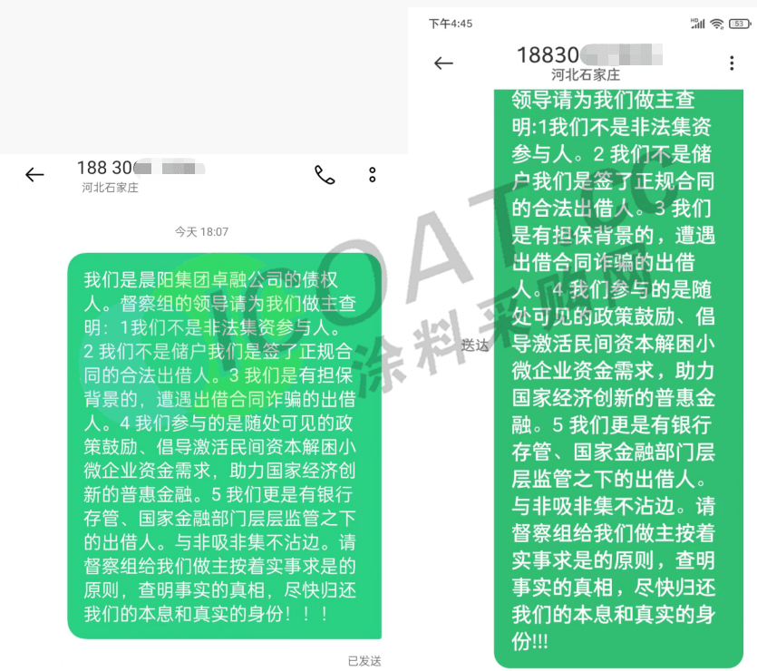 某债权人披露了《关于投资款兑付的三方合同》显示,其认购了晨阳水漆发行的,受托管理人为河北卓融股权投资基金管理有限公司的《冀金宝-金优选晨阳水漆叁号直接投融资工具》。其表示,这是借款合同,不是融资更不是非法集资,但如今却不知该向谁诉说。