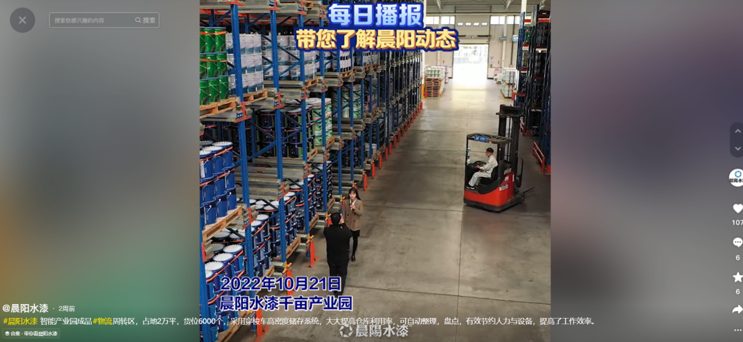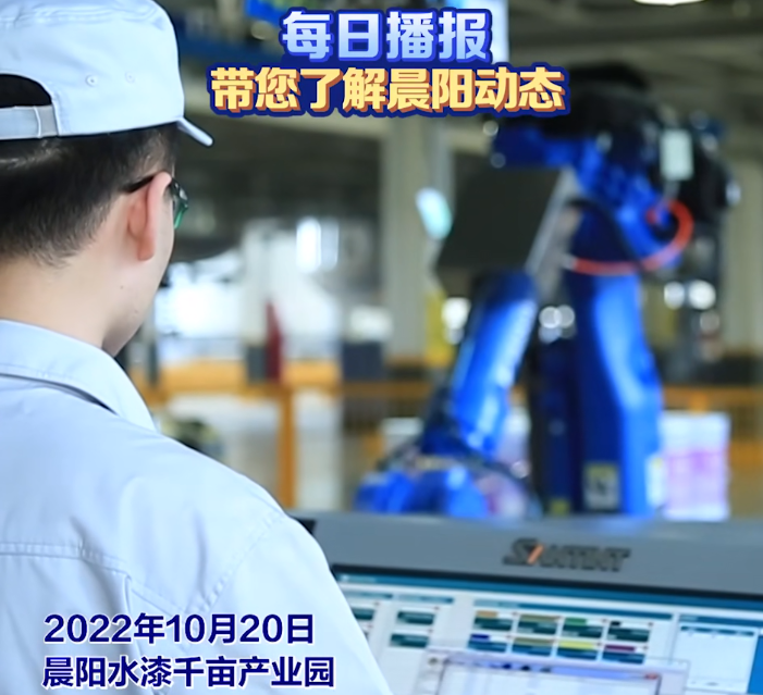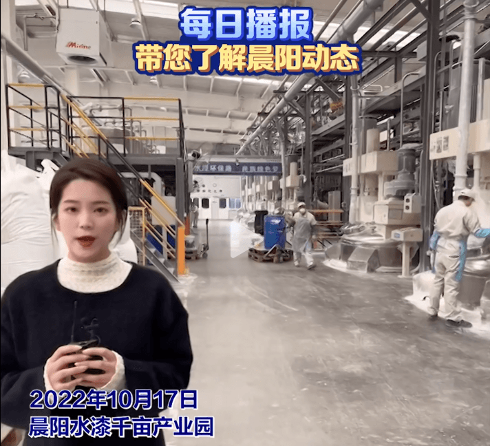 据晨阳水漆官方视频号发布的播报,2022年10月末,晨阳水漆千亩产业园中仍有工人正在操作设备进行生产,车间内看起来一切正常。