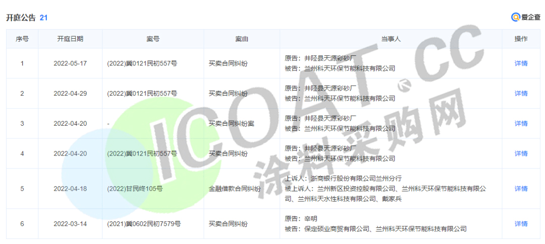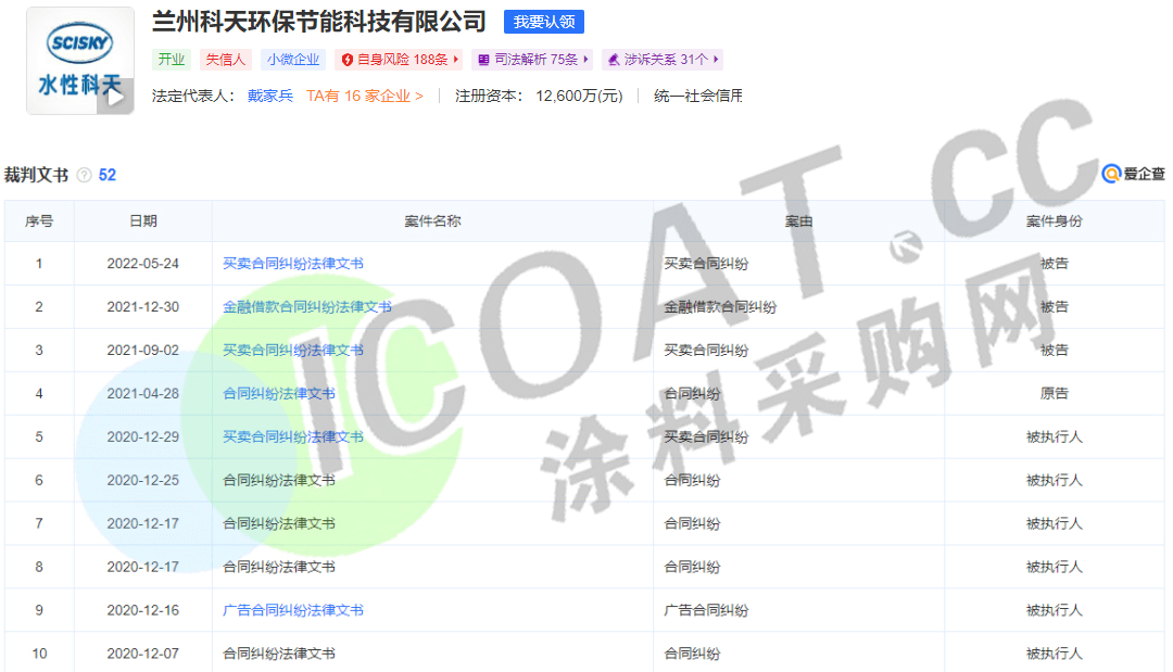 此外,水性科天还存在21项开庭公告,仅2022年就存在6项,案由包括但不限于买卖合同纠纷、金融借款合同纠纷等,原告涉及彩砂、个人、银行等多个行业领域。