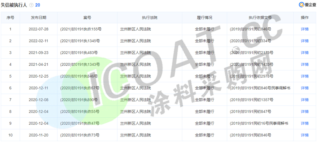 水性科天被列入失信被执行人20项,仅2022年就有两次,均为兰州新区人民法院因其全部未履行做出的措施。