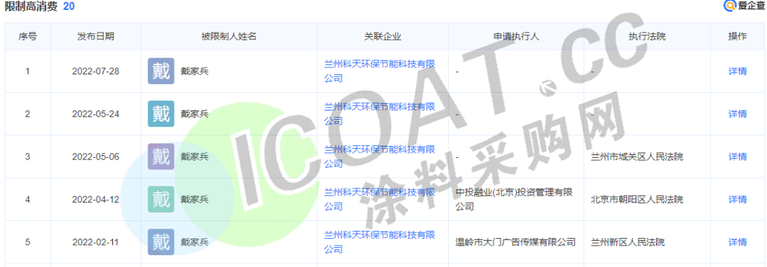 与晨阳水漆相同的是,科天环保的法人戴家兵也曾20次被限制高消费,其中2022年出现5次。