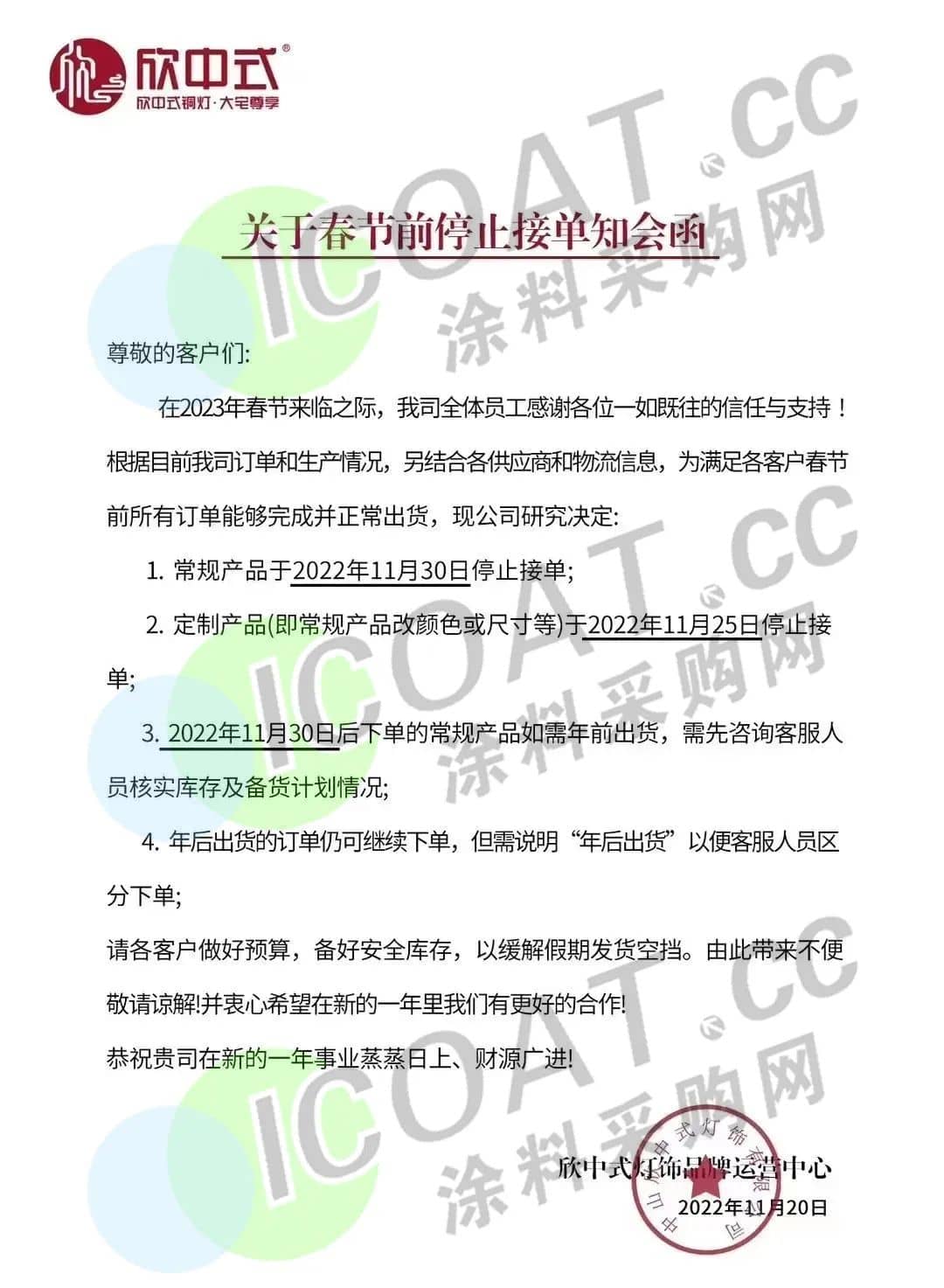 欣中式灯饰发布了《关于春节前停止接单知会函》,称常规产品于2022年11月30日停止接单;定制产品(即常规产品改颜色或尺寸等)于2022年11月25日停止接单。