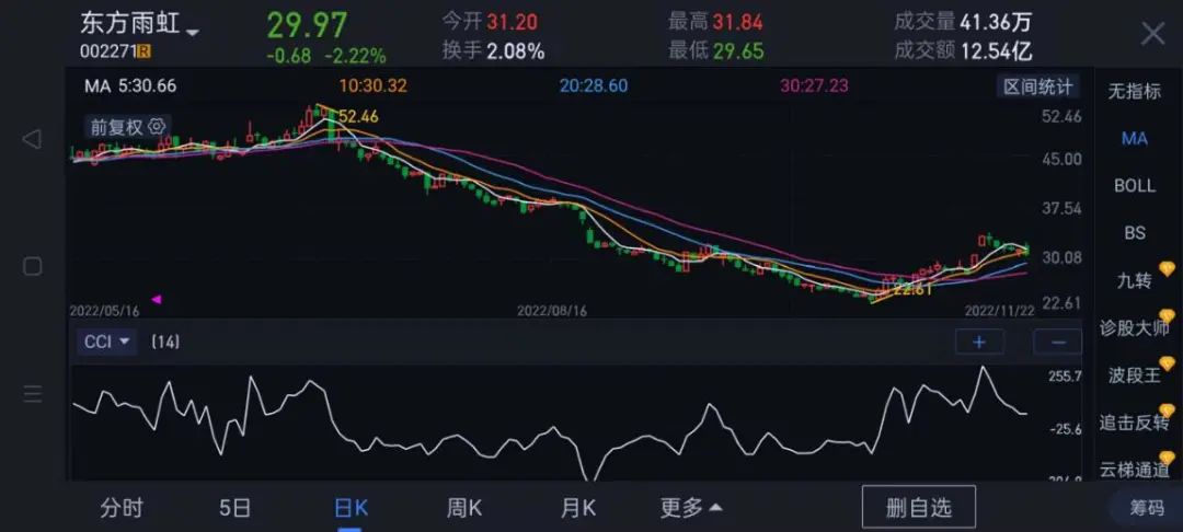 二级市场上,东方雨虹的表现也不再亮眼。11月22日,东方雨虹下跌2.22%,最低价格29.65元,尾盘收至29.97元,较年初跌超40%,总市值755亿元,较年初市值缩水超500亿元,较曾经的高点缩水了800亿,如果要冲击2000亿新高更是难以想象。