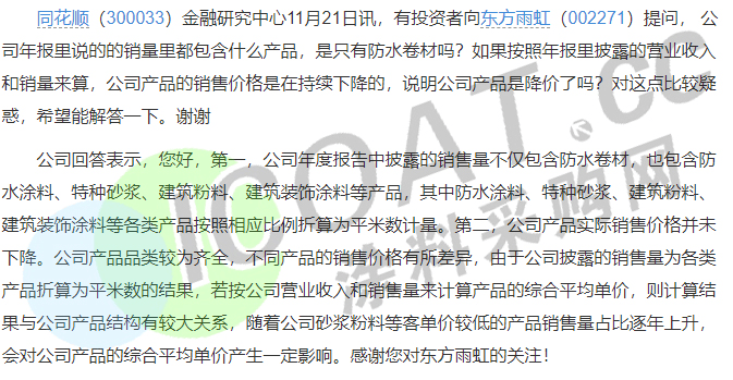 净利润和毛利率的下滑让人不禁怀疑,东方雨虹经营方面是否已经遇到了难题。近期有投资者提问,如果按照年报里披露的营业收入和销量来算,公司产品的销售价格是在持续下降的,说明公司产品是降价了吗?东方雨虹则表示,公司产品实际销售价格并未下降。