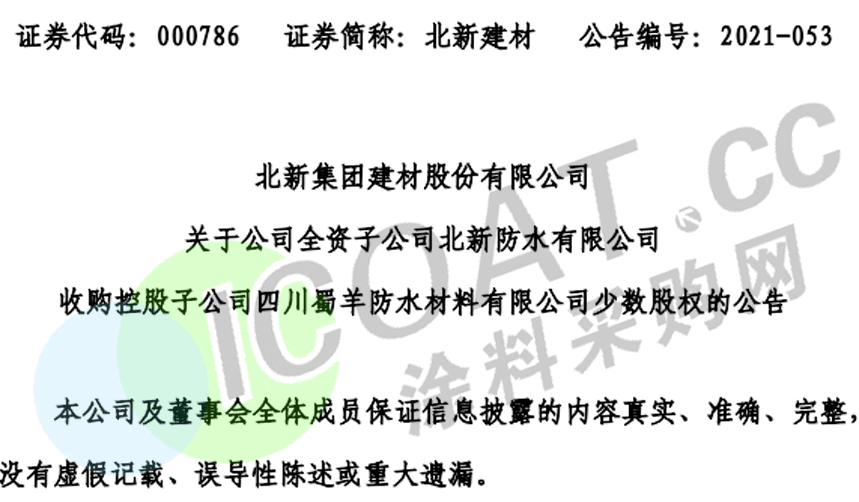 2021年9月25日,北新建材全资子公司北新防水拟以23,085.00万元收购四川蜀羊的剩余30%股权。本次收购完成后,北新防水持有100%股权。2019年8月,北新建材收购了四川蜀羊的70%股权。