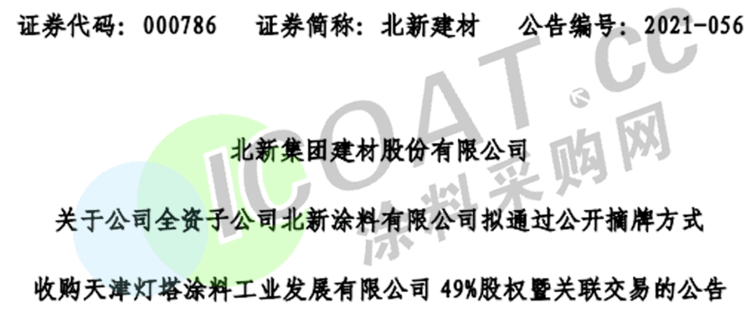 2021年9月24日,北新建材全资子公司北新涂料拟通过公开摘牌方式收购天津灯塔涂料工业发展有限公司49%股权,公开挂牌转让底价为5,939.45万元。