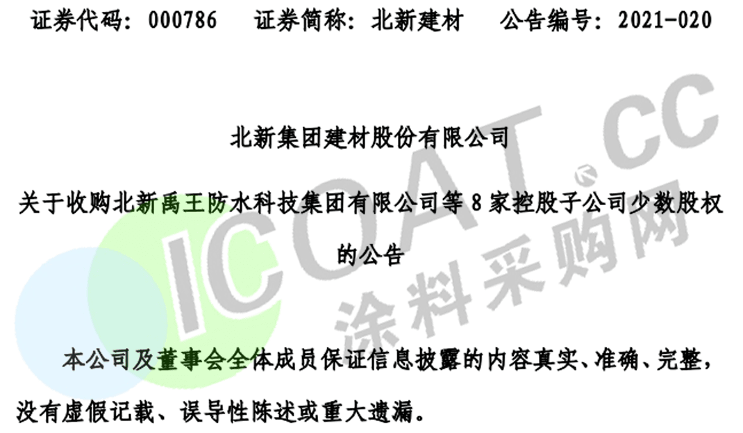 2021年3月31日,北新建材拟收购禹王系公司的剩余30%股权。本次收购完成后,公司将持有禹王系公司100%股权,禹王系公司将成为公司的全资子公司。而在2019年10月,北新建材分别收购了禹王防水、四川禹王、安徽禹王、湖北禹王、广东禹王、禹王工程、禹王橡胶、禹王化纤8家禹王系公司的70%股权,估算合计成交额近7.7亿元。