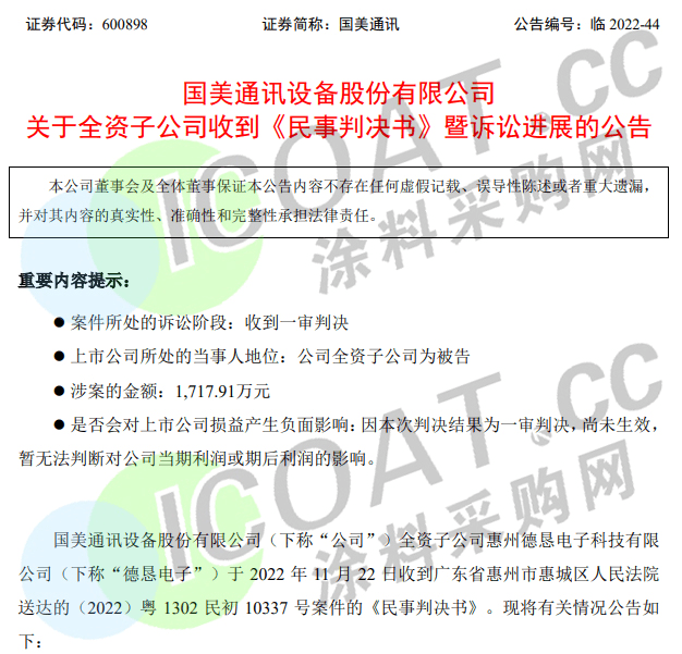 据公开资料,原告大连龙宁科技有限公司于2022年7月对德恳电子提起诉讼,要求德恳电子向大连龙宁支付拖欠货款1636.11万元,及逾期付款的违约金81.81万元(暂计至2022年4月1日)。