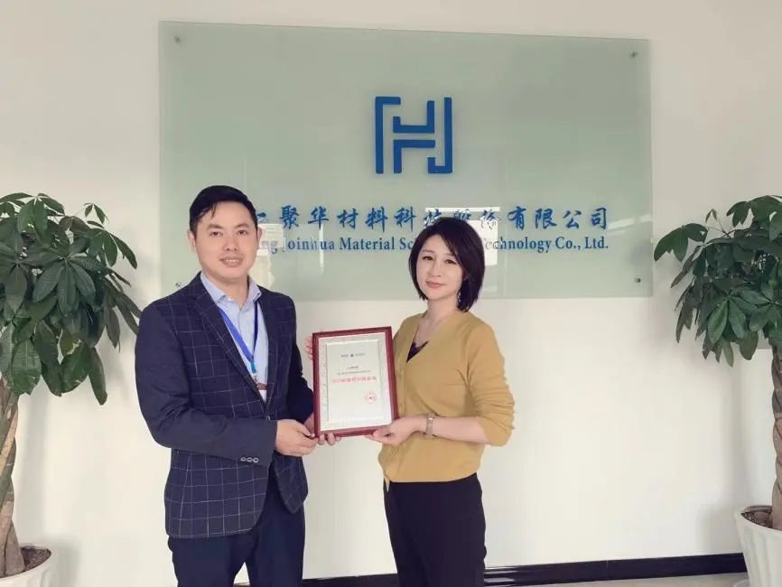 涂料采购网市场部总监张馨元(右)与聚华材料董事长张庆华(左)合影