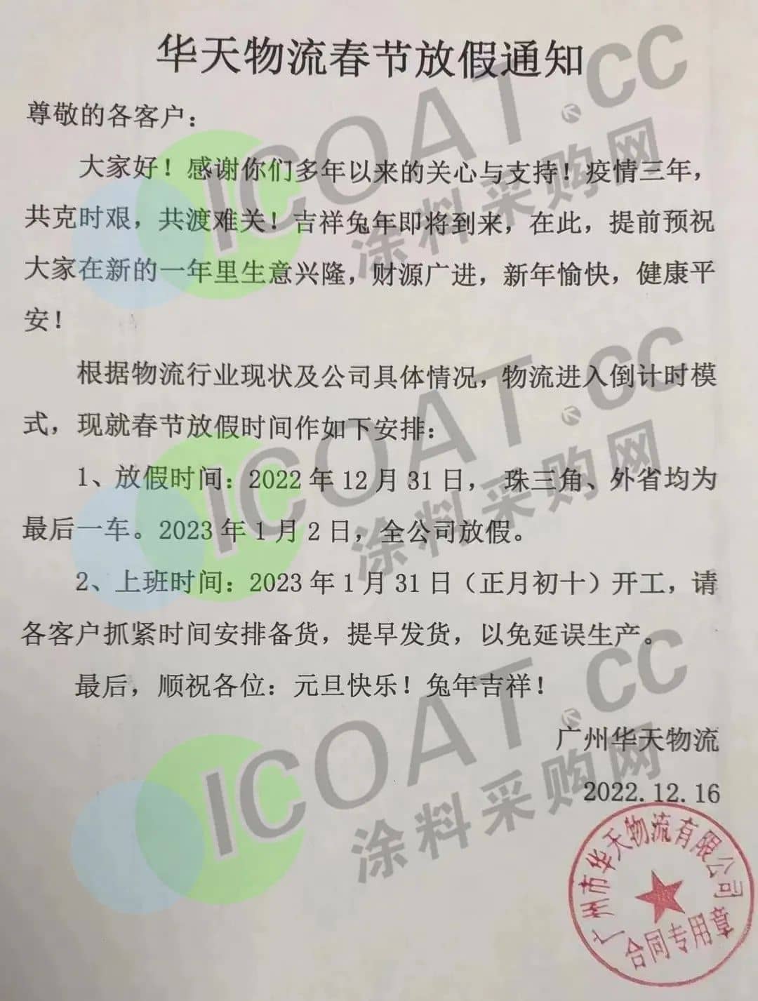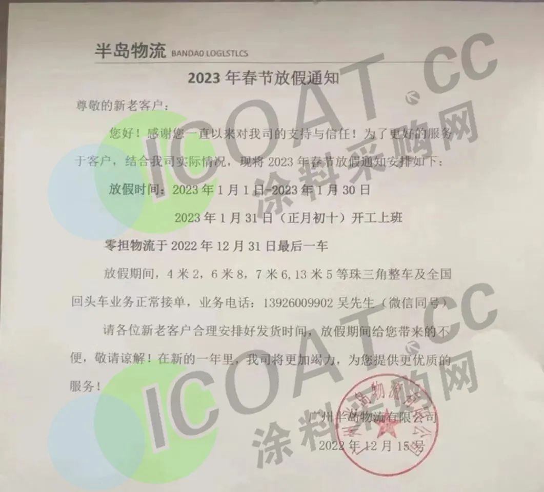 从以上各物流公司消息看,不少物流公司宣布在1月初便开始放假,更有甚至宣布放两个月的假,某大型零担公司春节放假时间是2023年1月1日至2023年2月28日,相当于直接停运两个月!物流的停运也在无声宣告着,涂料、化工等工业企业将提前结束一年的运营,开启春运返乡潮。