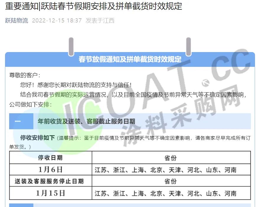 跃陆物流:1月6日停收江苏、浙江、上海、北京、天津、河北、山东、河南等地的货物。1月15日以上地区的送装及客服服务停止。