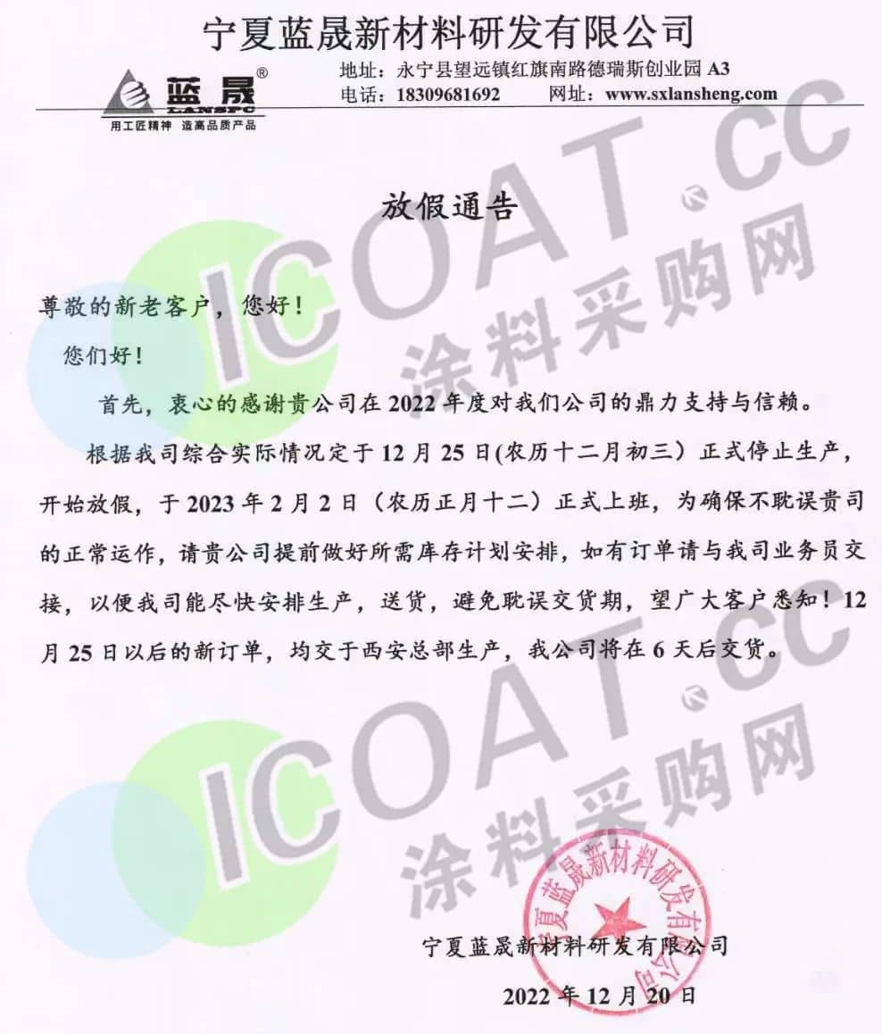 宁夏蓝晟新材料研发有限公司:定于12月25日正式停止生产开始放假,于2023年2月2日正式上班。12月25日以后的新订单,均交于西安总部生产,企业将在6天后交货。