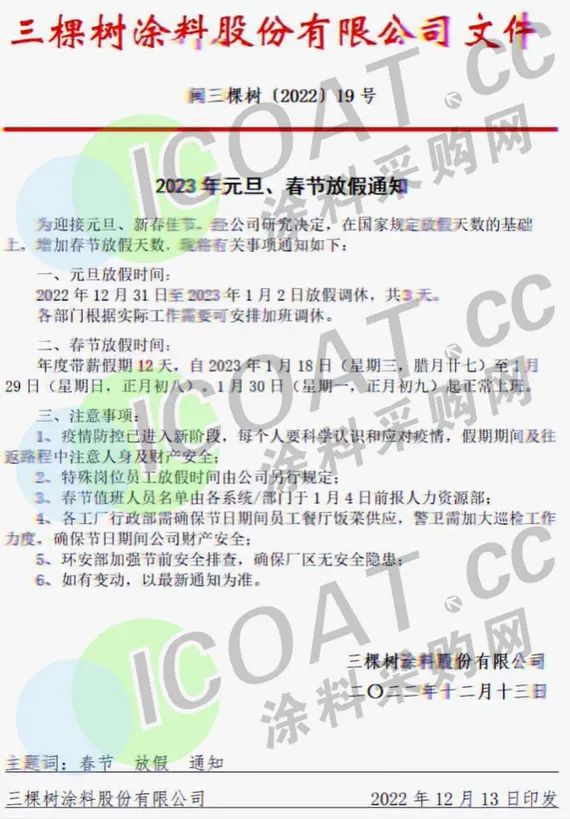 随着2022年步入尾声,元旦和春节的脚步也越来越近,三棵树、巴德士、蓝晟新材料、金展鸿等几十家涂料企业纷纷发布放假通知,有些春节假期甚至从2022年一直延续到2023年,变成了跨年的假期。
