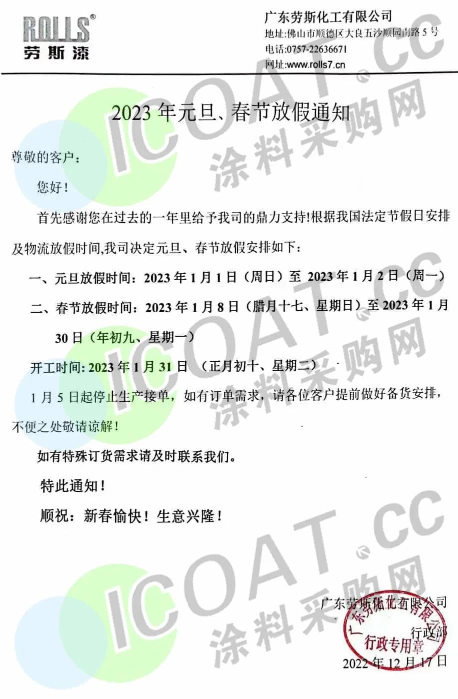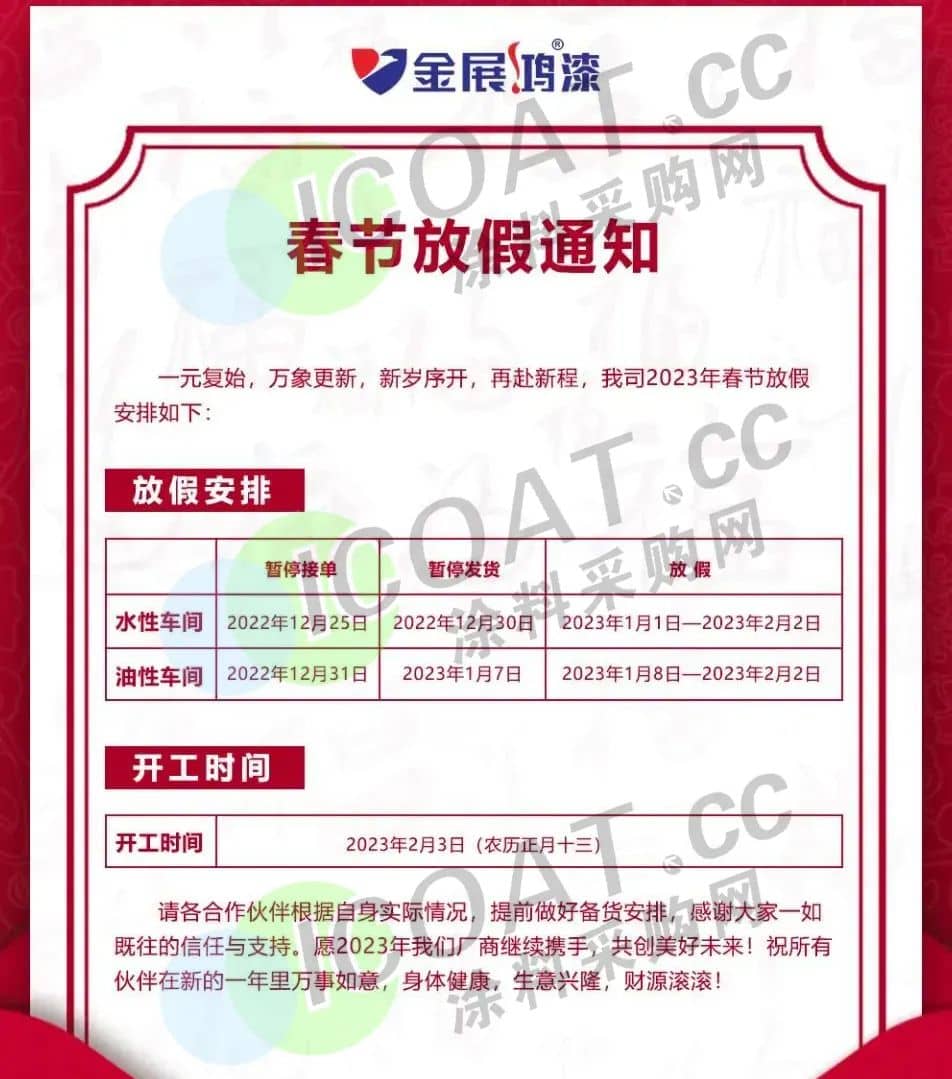 金展鸿漆:水性车间2022年12月25日暂停接单,12月30日暂停发货。油性车间2022年12月31日暂停接单,2023年1月7日暂停发货,2023年1月8日-2月2日放假,开工时间为2023年2月3日。