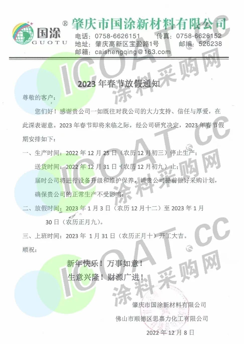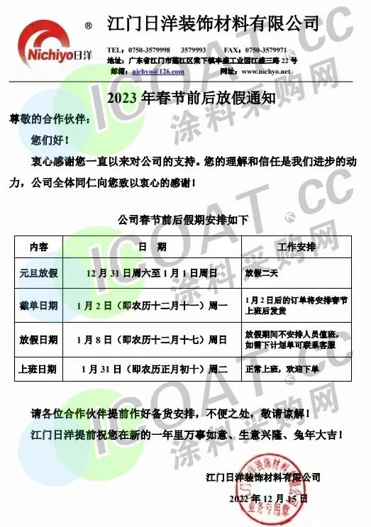 深圳市鼎轩涂料:2023年1月7日至2月6月放假,2023年2月7日正式上班。