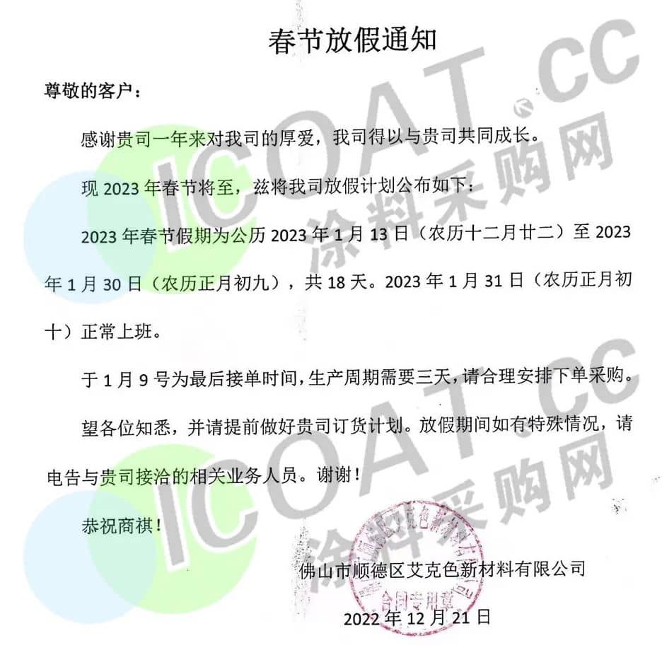 佛山市顺德区艾克色新材料:2023年春节假期为1月13日至1月30日,共18天,1月31日正常上班。1月9号为最后接单时间,生产周期需要三天,请合理安排下单采购。