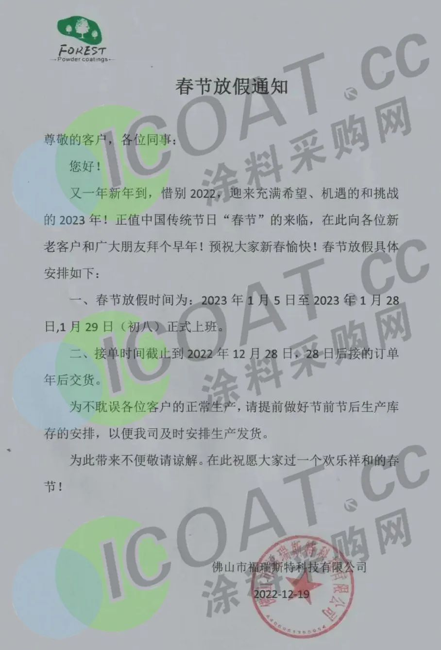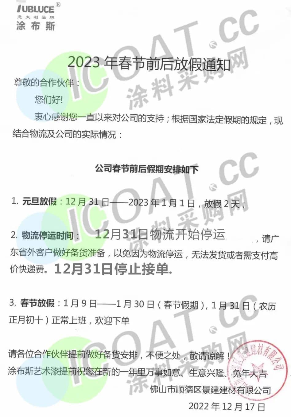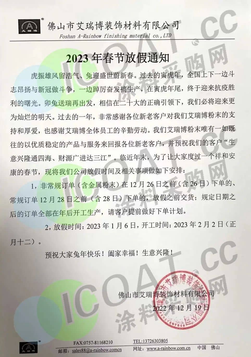 佛山市艾瑞博装饰材料:非常规订单(含金属粉末)在12月26日之前(含26日)下单的,常规订单12月28日之前(含28日)下单的,放假之前交货,之后的订单全部在年后开工生产。放假时间为2023年1月6日,开工时间为2023年2月2日。