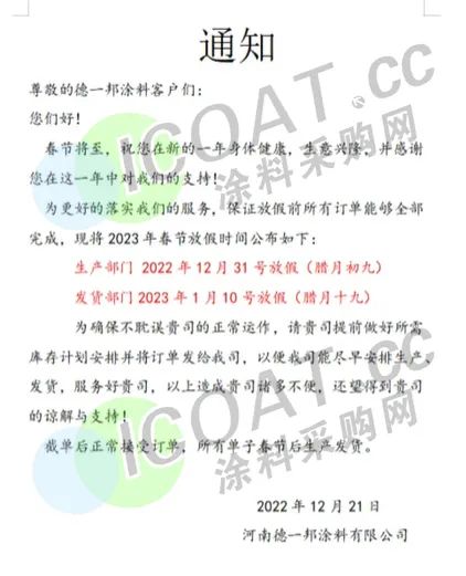 河南德一邦涂料:生产部门2022年12月31号放假,发货部门2023年1月10号放假。截单后正常接受订单,所有单子春节后生产发货。