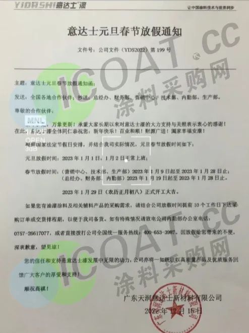 意达士漆:春节放假时间:(营销中心、技术、生产部)2023年1月9日起至2023年1月28日止;(总经办、财务部、内勤部)2023年1月19日起至2023年1月28日止。2023年1月29日正式开工大吉。