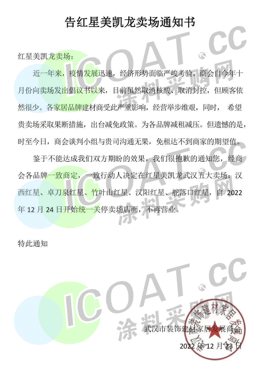 但遗憾的是,时至今日,商会谈判小组与贵司沟通无果,免租达不到商家的期望值。鉴于不能达成我们双方期盼的效果,经商会各品牌一致商定,一致行动人决定在红星美凯龙武汉五大卖场:汉西红星、卓刀泉红星、竹叶山红星、汉阳红星、舵落口红星,自2022年12月24日开始统一关停卖场店面,不再营业。