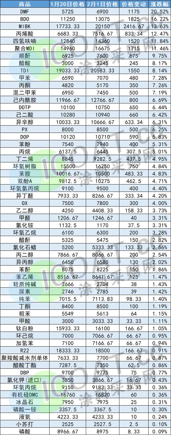 此外,目前50多种化工品报价较春节前(1月20日)出现大幅调升。其中溶剂类产品DMF价格上涨超过20%,丙烯酸、聚合MDI、BDO等产品价格调涨超过10%。MIBK、BETVLCTOR伟德国际网页版 等产品吨价调涨超过千元。