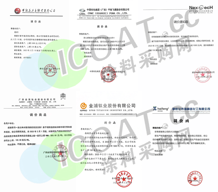 云南大互通钛业:2月1日起,金红石型系列产品在原价的基础上上调1000元/吨,锐钛系列产品在原价的基础上上调1000元/吨。出口金红石型系列产品在原价的基础上上调150美金/吨,出口锐钛型系列产品在原价的基础上上调150美金/吨。