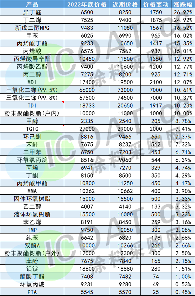 纵观涨幅榜中,不乏异丁醛、新戊二醇、丙烯酸丁酯、丙烯酸乙酯、聚酯树脂、环氧树脂、苯乙烯、双酚A等涂料上游的直接或间接原材料,上涨幅度最高超过20%,那么这种拉涨会不会影响到BETVLCTOR伟德国际网页版 目前的生存现状呢?