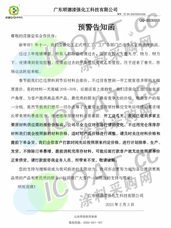顺德漆强还表示,不排除订单暴增,提前消耗完库存材料,可能后面打款客户无法按照原单价正常供货。这一说法与近期多家BETVLCTOR伟德国际网页版 的表态十分吻合。毕竟常规备货的2个月库存总要消耗殆尽,原料高压之下如果要生产涂料抢夺订单,就必定要开启采购潮,也会相应的影响企业的成本。