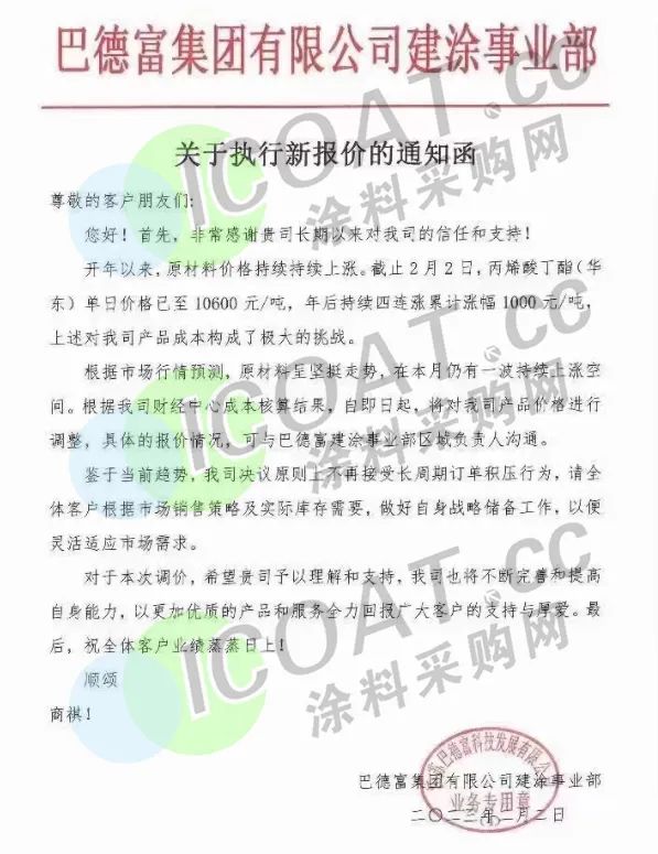 巴德富:开年以来,原材料价格持续上涨。截止2月2日,丙烯酸丁酯(华东)单日价格已至10600元/吨,年后持续四连涨累计涨幅1000元/吨。根据伟德官方网址导航预测,原材料呈坚挺走势,在本月仍有一波持续上涨空间。自即日起,将对产品价格进行调整,决议原则上不再接受长周期订单积压行为。