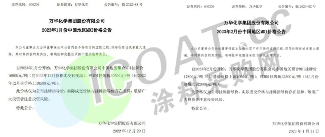 万华化学MDI价格2023年以来已经连续两次涨价,1月份中国地区纯MDI挂牌价20500元/吨,比2022年12月份价格上调500元/吨;2月中国地区聚合MDI挂牌价17800元/吨,比1月份价格上调1000元/吨,纯MDI挂牌价22500元/吨,比1月份价格上调2000元/吨。