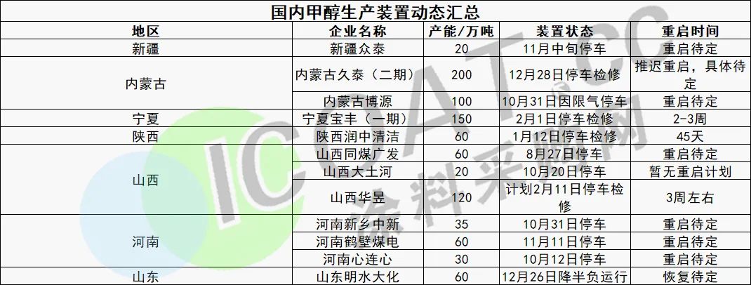 宁夏宝丰(一期)150万吨/年甲醇停车检修(一期另30万吨/年正常运行),预计时长2-3周。