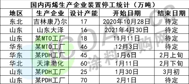 多家丙烯企业正在停工检修阶段,影响产能超5万吨。
