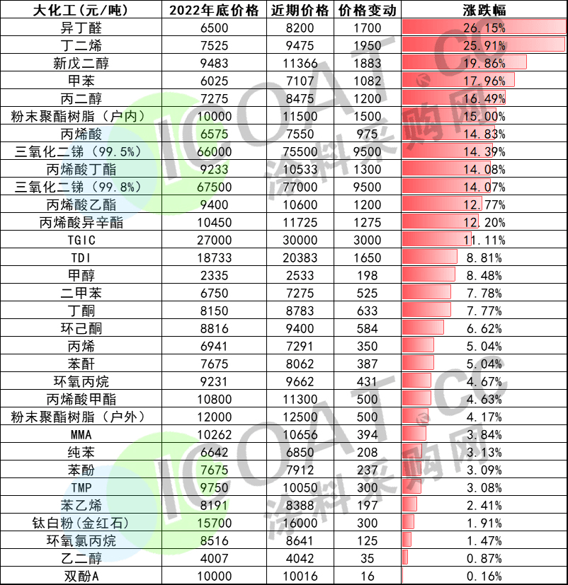 而在龙头企业的“狂飙”节奏之下,30多种原材料年内出现上涨趋势。涂料产业链上游的异丁醛、新戊二醇、聚酯树脂、TGIC等也出现了不同幅度的价格上涨。