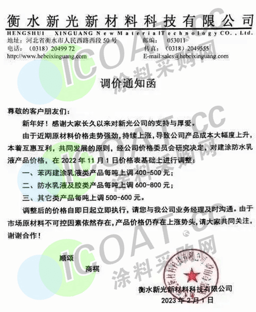在溶剂行业,纯苯、甲苯、二甲苯、环己酮等原材料也在年内出现上涨的情况,涨幅在10%左右。乳液三巨头的涨价也于2月初安排妥当,衡水新光苯丙建涂乳液类上调400-500元/吨,防水乳液及胶类上调600-800元/吨,其它类上调500-600元/吨;保立佳对建筑事业部推广产品价格做不同程度的上调,具体价格实行“一单一议”政策;巴德富对产品价格进行调整,决议原则上不再接受长周期订单积压行为。