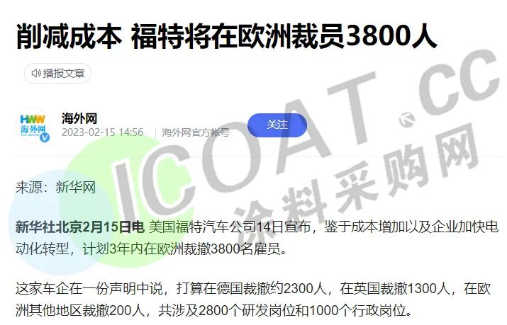 福特汽车宣布,作为降本和工程开发集中计划的一部分,公司预计在欧洲地区裁撤3800个产品开发及管理岗位,约合当地九分之一的岗位数量。打算在德国裁撤约2300人,在英国裁撤1300人,在欧洲其他地区裁撤200人,共涉及2800个研发岗位和1000个行政岗位。