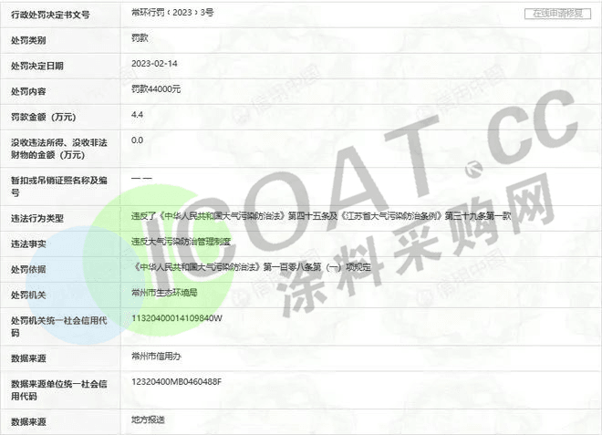 江苏大使同丰涂料有限公司因违反了《中华人民共和国大气污染防治法》第四十五条及《江苏省大气污染防治条例》第三十九条第一款,被处罚4.4万元。