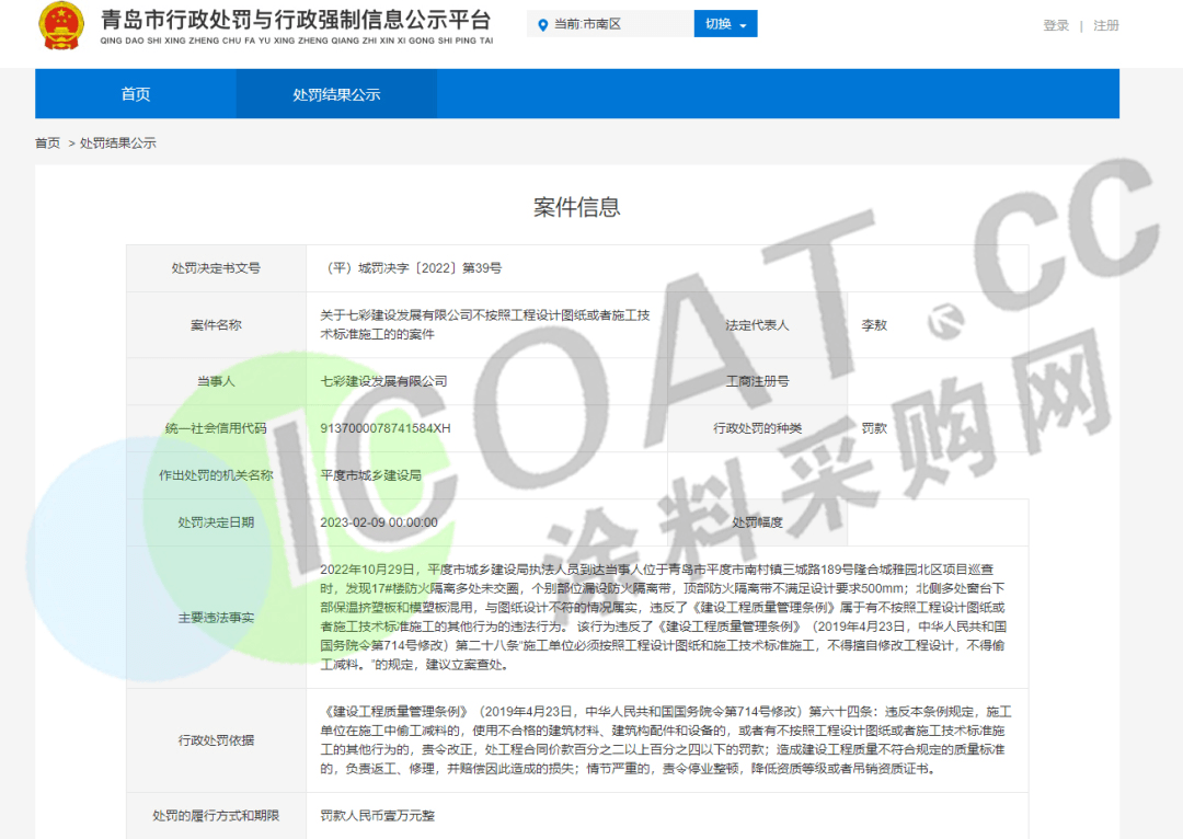 青岛市公示了关于“七彩建设发展有限公司(山东七彩涂料工程有限公司)不按照工程设计图纸或者施工技术标准施工”的案件信息,平度市城乡建设局给予七彩建设发展有限公司罚款人民币壹万元整的行政处罚。